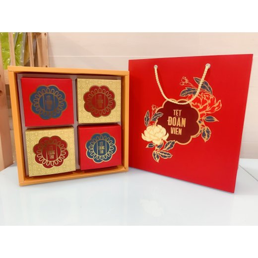 Hộp 4 bánh tinh xảo, tượng trưng cho sự sum vầy, đủ đầy.