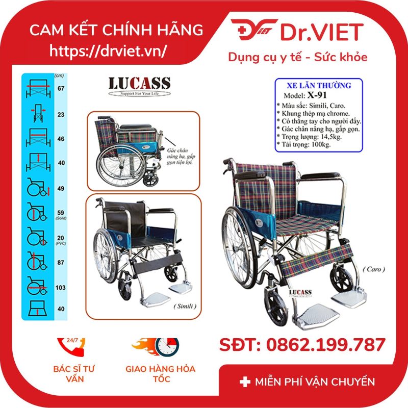 là dòng xe lăn cho người già người bệnh rất thông dụng, lý do dòng Xe Lăn Tay Lucass X91 được tin dùng nhiều là do những tiện dụng khi sử dụng mà xe mang lại. phần ghế ngồi được làm tử vải Caro sạch sẽ thoáng mát ngồi lâu không bị nóng lưng, phù hợp di chuyển người già người bệnh đặc biệt khi trời năng nóng không bị tích mồ hôi trong nhiệt độ nắng nóng. Khung xe được thiết kế từ thép mạ Crom cho tải trọng lớn. Đặc Biệt xe có thắng tay phía sau giúp an toàn và tiện lợi hơn khi di chuyển.
